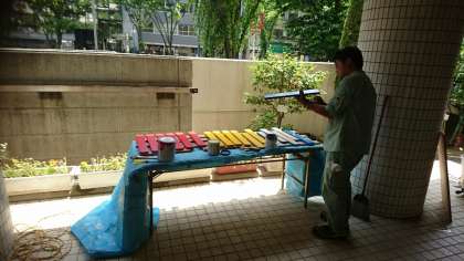 管理作業員さんが、逆上がり補助台を丁寧に直してくださいました。きれいにペンキで色を付けてくださっています。1年生は今日、生活の学習で管理作業員さんの仕事を見学していました。