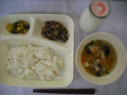 「プルコギ、とうふのスープ、チンゲンサイとコーンの甘酢あえ、ごはん、牛乳」