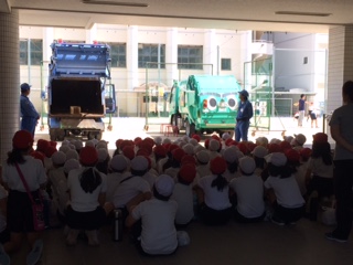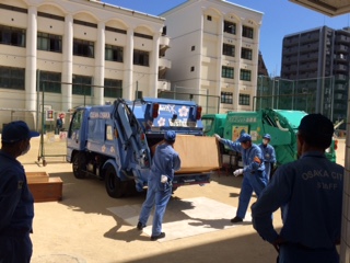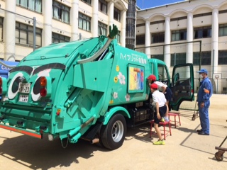今日は大阪市環境局の方に来ていただき、パッカー車の体験を行いました。
