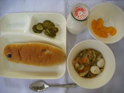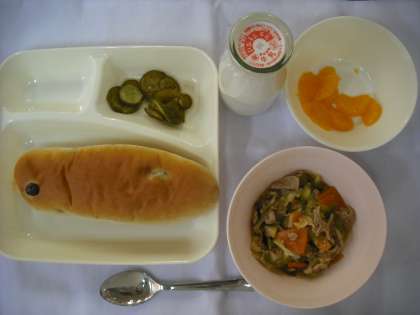 「八宝菜、きゅうりの中華あえ、みかん(缶)、レーズンパン、牛乳」