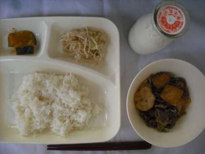 「すき焼き煮(個別対応献立・ふ)、かぼちゃのあまみつかけ、もやしのごま酢あえ、ごはん、牛乳」