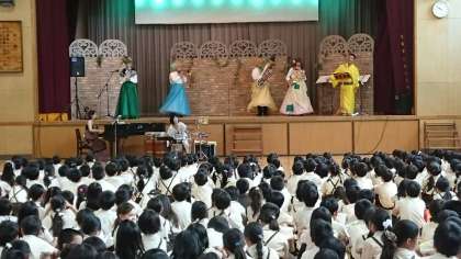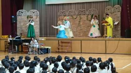 今日は、1〜4年生が音楽劇「シンデレラ」を鑑賞しています。トランペットやホルンなど金管楽器を中心に迫力のある演奏を楽しんでいます。明日は、6年生が落語、26日(火)は5年生が能を鑑賞します。この芸術鑑賞は、北区役所の取り組みの一環として行われています。