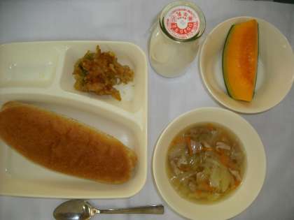 「カレードリア、スープ、クインシーメロン、ライ麦パン、牛乳」