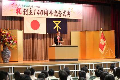 6年生がお祝いの言葉を堂々と発表し、お祝い歌として「僕らは堀川の子どもやで」を声高々に歌いました。