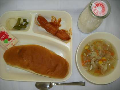 「ウインナーのケチャップソース、野菜スープ、じゃがいもと三度豆のサラダ、マヨネーズ、レーズンパン、牛乳」