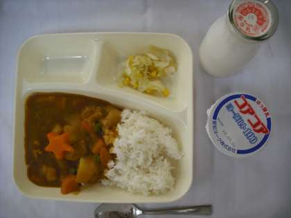 「チキンカレーライス、キャベツとコーンのサラダ、ヨーグルト、牛乳」