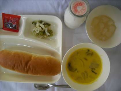 「かぼちゃのクリームシチュー、キャベツと三度豆のサラダ、和なし(缶づめ)、大型コッペパン、いちごジャム、牛乳」