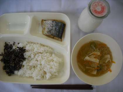 「さごしの塩焼き、みそ汁、牛ひじきそぼろ、ごはん、牛乳」