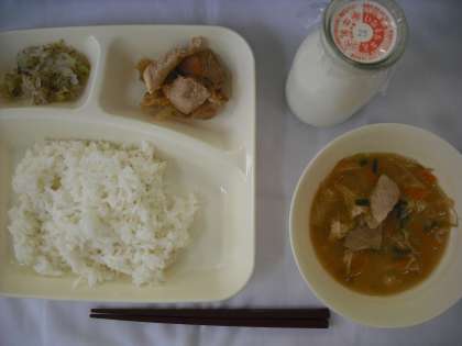 「鶏肉の甘辛焼き、みそ汁、キャベツの赤じそあえ、ごはん、牛乳」