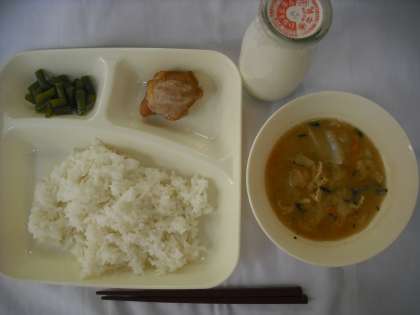 「鶏肉のしょうゆバター焼き、みそ汁、三度豆のからしじょうゆあえ、ごはん、牛乳」