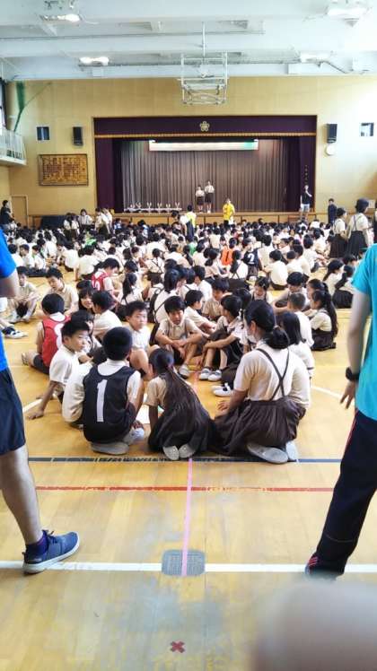 今日は縦割りのゲーム集会がありました。「さて、何人の人が舞台にいたでしょう?」