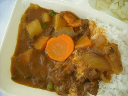 ハヤシライスには、クラスに1〜2個程度ハート形に切り抜いたラッキー人参が入っています。サクランボは、国産を使用しています。