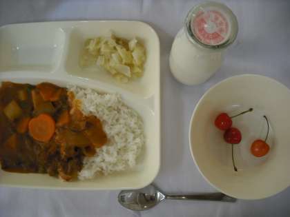 「ハヤシライス、キャベツのゆずドレッシング、さくらんぼ、牛乳」