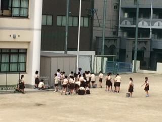 運動場手洗い場の周りで、5年生理科の学習が行われています。