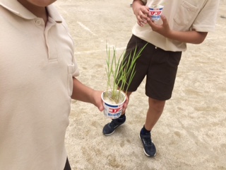 近づいてみると、今までカップの中で育てていたイネの苗をバケツに植えています。