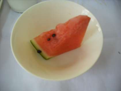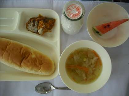 「かぼちゃのミートグラタン、スープ、すいか、おさつパン、牛乳」