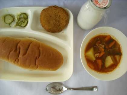 「チキンレバーカツ、ケチャップ煮、キャベツときゅうりのサラダ、黒糖パン、牛乳」