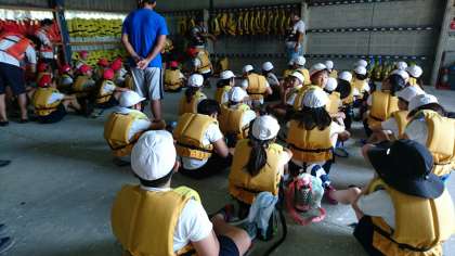 ライフジャケットを着て、スタッフの方の説明を聞きます。