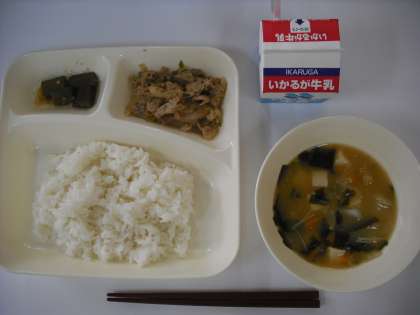 「豚肉の甘辛焼き、みそ汁、オクラのおかかいため、ごはん、牛乳」