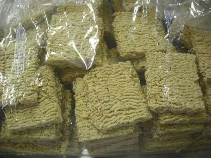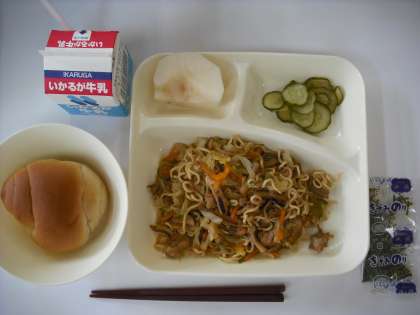 「焼きそば、きざみのり、きゅうり甘酢づけ、なし(二十世紀)、黒糖パン、牛乳」