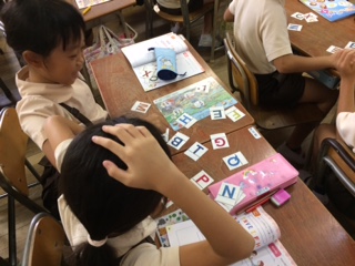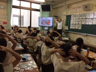 ダニエル先生と担任の先生との授業です。キーワードをしっかり聞き取り、カードを取る「キーワードゲーム」。キーワードを言ってくれるのは、参観に来てくださったお家の方でしたよ。