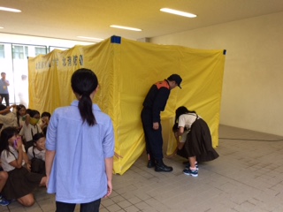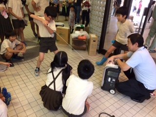 備蓄物資のコーナーでは、簡易トイレに座ってみたり、自家発電機で明かりをつける体験をしました。