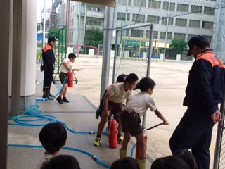 水消火器での練習コーナーでは、消火器の使い方を習い