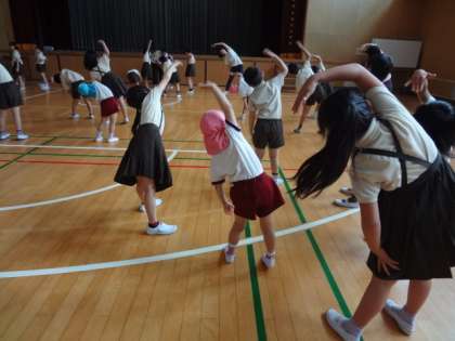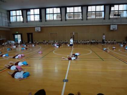 6月24日(火)、講堂で2年生の児童と堀川幼稚園の園児が一緒に、リズム体操に取り組みました。