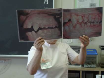 6月25日(水)、歯科衛生士の方が来られて、6年生に歯と口の健康教室を開いてくださいました。はじめに、サルの健康な歯と病気の歯の写真を見せてくださいました。次になぜそうなるのか、みんなで考えた後、正しい歯磨きが大切であることを教えてくださいました。その後、正しい歯磨きをみんなで実践し、歯の汚れが取れていることを確認しました。