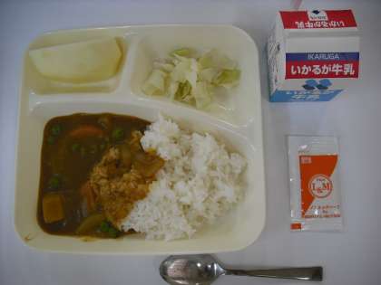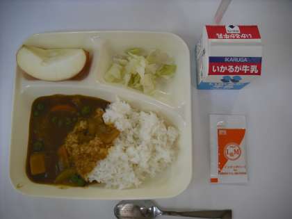 「ポークカレーライス(米粉のカレールウ)、キャベツのサラダ(ノンエッグドレッシング)、りんご、牛乳」