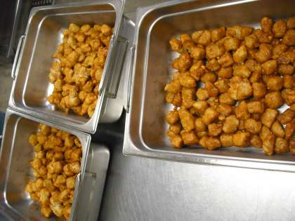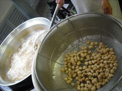 まぐろのオーロラ煮は、児童に大人気の献立です。しょうが汁で下味をつけたまぐろにでんぷんをまぶし、油で揚げ、ケチャップ、赤みそ、砂糖を合わせたタレをからめています。