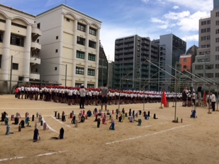 1時間目より全校で運動会の練習を行いました。開会式・閉会式の練習です。