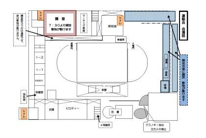 赤の部分:講堂のみ朝7:30より開放します。敷物を敷いてご利用ください。