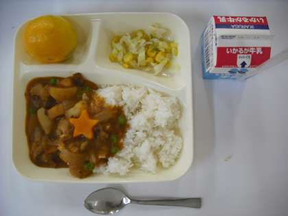 「ハヤシライス[米粉]、キャベツとコーンのサラダ、みかん、牛乳」