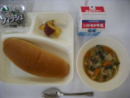 「豚肉といかの中華煮、大学いも、ミニフィッシュ、黒糖パン、牛乳」