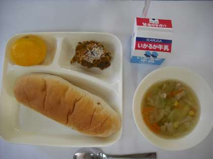 「なすのミートグラタン、鶏肉と野菜のスープ、みかん、レーズンパン、牛乳」