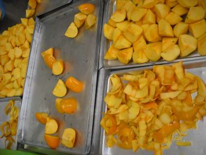 柿は古くから栽培されている秋が旬の食べ物です。堀川小学校では、食べやすいように皮をむいています。