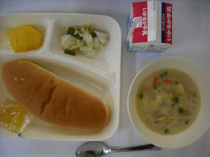 「コーンクリームシチュー(米粉)・キャベツと三度目豆のサラダ、柿、ごはん、牛乳」