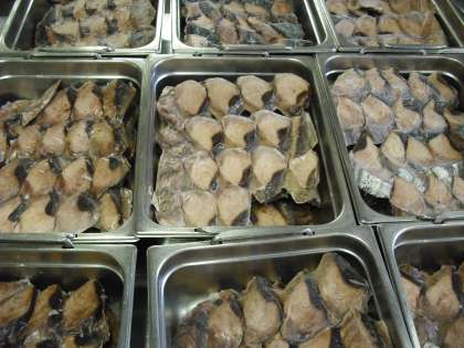 なまりぶしは、カツオの身を蒸して干したものです。給食では、焼き物機(オーブン)を使って蒸し煮にしています。骨はありません。