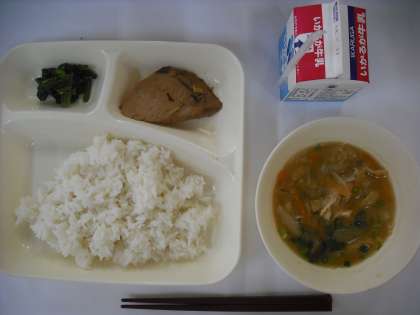 「なまりぶしのしょうが煮、みそ汁、ほうれん草のごまあえ、ごはん、牛乳」