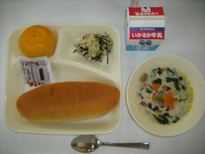 「きのこのクリームシチュー、キャベツのひじきドレッシング、みかん、コッペパン、いちごジャム、牛乳」