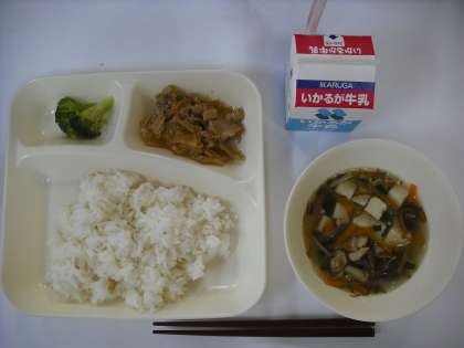 「豚肉のコチジャンいため、もずくスープ、ブロッコリーのナムル風あえもの、ごはん、牛乳」