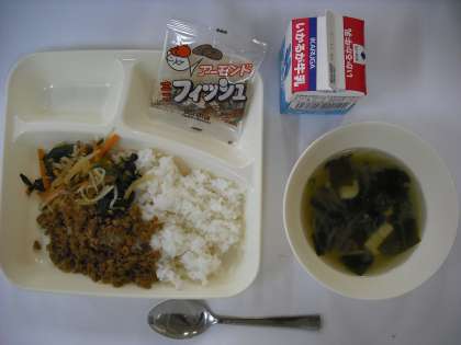 「ビビンバ、わかめスープ、アーモンドフィッシュ、牛乳」