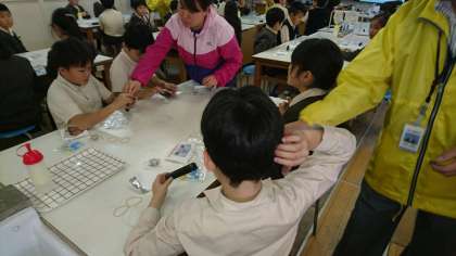 今日は、関西電気保安協会の方に来ていただき、4年生の理科出前授業がありました。内容は、備長炭を使って簡易の乾電池を作るという活動でした。ゲストティチャーの方に助けてもらいながら一人に一つの乾電池が出来上がりました。