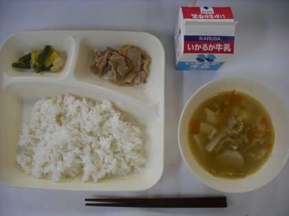 給食には、いろいろな種類の汁ものが登場します。みそ汁、すまし汁、けんちん汁、五目汁、豚汁、つみれ汁、ミネストローネ、コーンスープ、豆乳スープ、中華スープ、雑煮、トック、シチューなどです。今日はけんちん汁が登場しました。