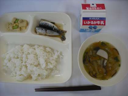 「いわしのしょうが煮、うすくず汁、高野どうふの卵とじ、ごはん、牛乳」