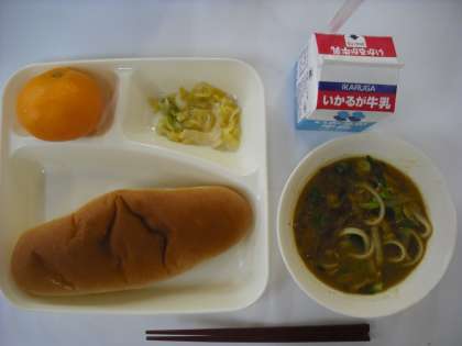 「カレーうどん、はくさいのおひたし、みかん、黒糖パン、牛乳」