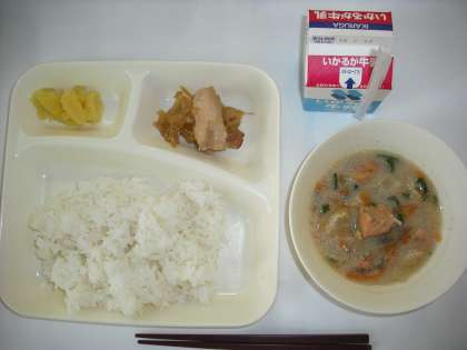 「鶏肉の甘辛焼き、かす汁、くりきんとん、ごはん、牛乳」
