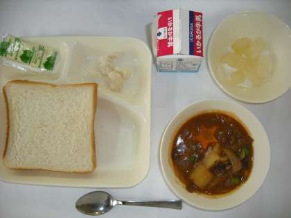 「ビーフシチュー、カリフラワーのピクルス、和なしかんづめ、食パン、ソフトマーガリン、牛乳」