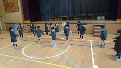 今日は、体育館で1年生が昔遊びをしました。今週、インフルエンザで学級休業があったため地域の方には来ていただけませんでしたが楽しい活動になりました。「はごいた」「こま回し」「かるた」「おはじき」など日本の文化に触れるいい機会になりました。